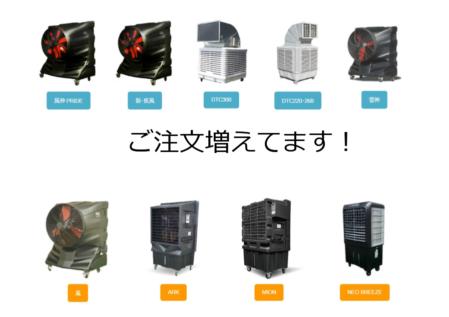 冷風機のご注文・ご相談が増えております 現在、冷風機のご注文ならびに熱中症対策に向けた導入のご相談が増えております。 例年、夏季に入りますとご注文が集中し、納期が最長で1か月ほどかかる場合がございます。 確実なご準備のためにも、ぜひお早めのご検討をお願いいたします。 Category: 新着情報2026年3月27日Post navigationPreviousPrevious post:グループ会社にて短期レンタル開始!Related postsグループ会社にて短期レンタル開始!2026年3月3日展示会のお知らせ2026年2月6日YouTube更新しました!2026年2月3日展示会のお知らせ2026年1月20日価格改定のお知らせ2026年1月19日新年のご挨拶2026年1月5日