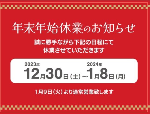 12月182023新着情報 平素は格別のお引き立てをいただき厚くお礼申し上げます。 弊社では、誠に勝手ながら下記日程を年末年始休業とさせていただきます。 ■ 年末年始休業期間 2023年12月30日(土) ~ 2024年1月8日(月) 休業期間中にいただいたお問合せについては、営業開始日以降に順次回答させていただきます。 皆様には大変ご不便をおかけいたしますが、何卒ご理解の程お願い申し上げます。 Category: 新着情報2023年12月18日Post navigationPreviousPrevious post:【展示会】たくさんのご来場ありがとうございました!NextNext post:令和6年 能登半島地震につきましてRelated posts2025年12月10日(水)~12日(金)東京ビックサイト展示会のお知らせ2025年12月3日【お知らせ】年末年始休業について2025年12月3日『イプロス』製品ランキングにTOP100入りました!2025年11月26日赤外線融雪ヒーターMAGMA(マグマ) 商品ページリニューアルしました!2025年10月30日2025年夏シーズンもご利用ありがとうございました!2025年10月15日赤外線融雪ヒーターMAGMA、お問い合わせ急増中!2025年9月26日