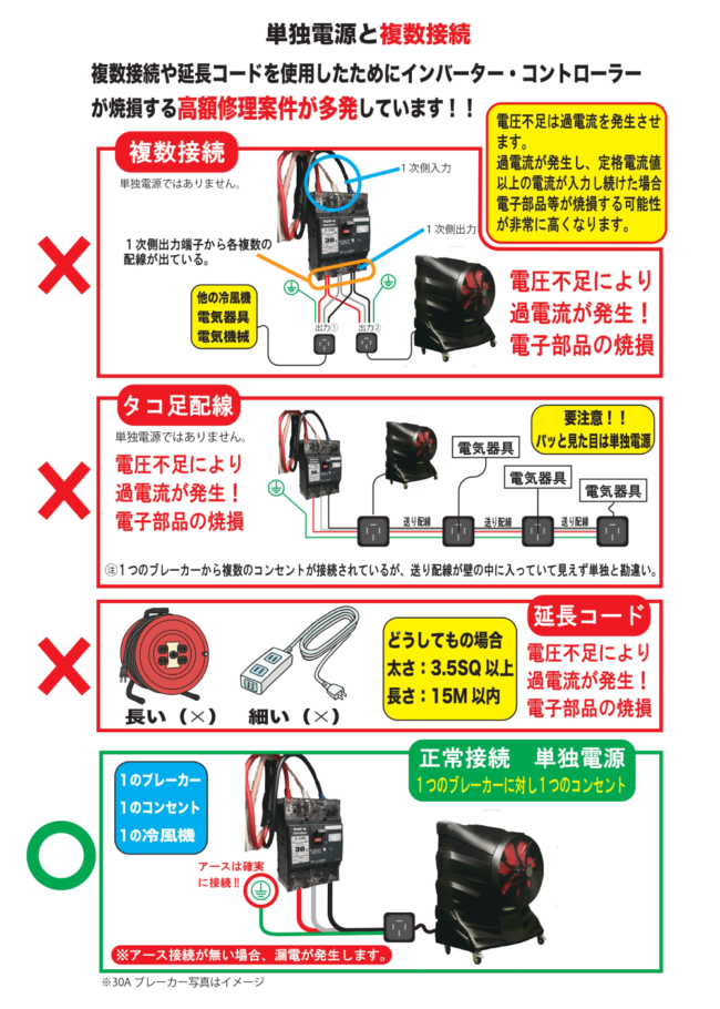 大型冷風機を誤った方法で使用したことによる故障・不具合が多発しています。 特に、タコ足配線や不適切な延長コードを使ったことによる過電流が原因です。 過電流が起きると最悪の場合インバーターが焼損します。 【 必ずお守りくだ…
