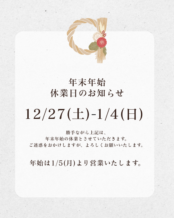 【お知らせ】年末年始休業について 平素は格別のお引き立てをいただき厚くお礼申し上げます。 弊社では、誠に勝手ながら下記日程を年末年始休業とさせていただきます。 ■ 年末年始休業期間 2025年12月27日(土)~ 202…