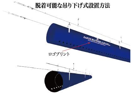 布(クロス)で作られるクロスダクトは、とても軽量のため、ワイヤーなどで簡単に吊り下げる事ができ、取り付け工事も容易です。