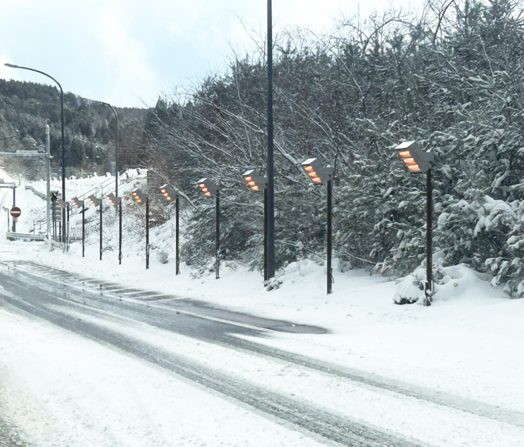 赤外線で雪や氷に直接的にし作用し効率的に雪害対策ができる融雪装置です。