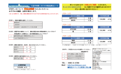 こちらよりシートをダウンロードし建物の広さ・気温など詳細情報を入力いただくことで、お客様の現場に合った機種・台数をご確認いただけます。